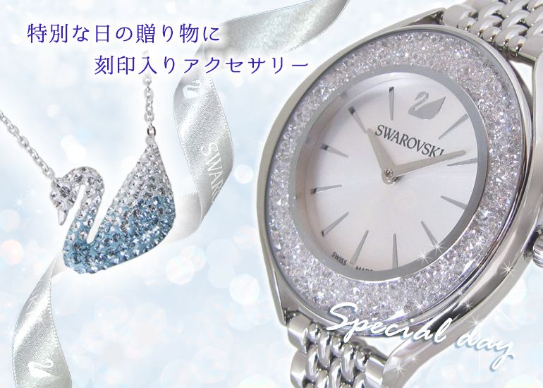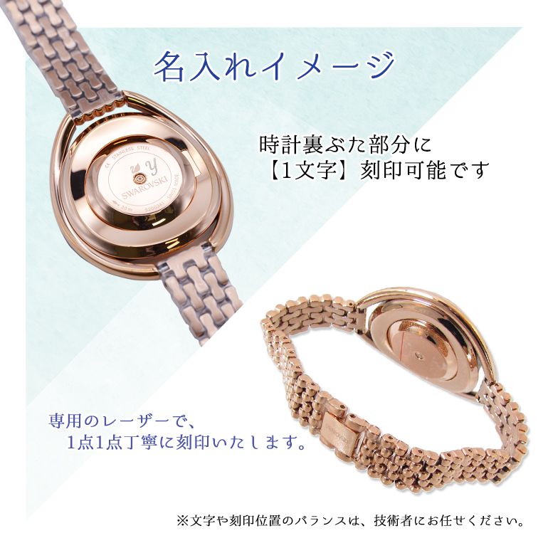 ギフトにもぴったりのスワロフスキーのアクセサリー感覚で使える腕時計に名入れが可能 [生産国] スイス [ムーブメント] スイス製クォーツ [文字盤カラー] シルバー サンレイパターン [ベルトカラー] ローズゴールド [ケース素材] 約1700個のクリスタル付ステンレススチール [ベルト素材] ポリッシュ加工のローズゴールドPVDメタル [仕様] ・クオーツ(電池式) ・日常生活防水 (3気圧防水) [サイズ(約)] 37mm×45mm×厚み9mm [腕周り(約)] 14cm-19cm [付属品] 純正箱 取扱説明書 ※ベルト調整可能 (代金引換は不可) ご注文時に手首の実寸をお知らせください。