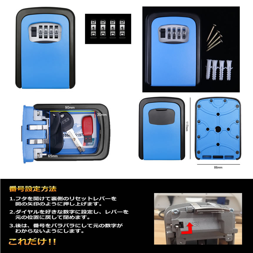 ■商品説明■ 複数の人がドアを開けたい時のキー管理に!!! ・会社の倉庫の管理用に使えます!! ・合鍵がなくても番号のみで解錠できる!! ・合鍵を入れておけば忘れた際も解錠できます!! ・留守時のお金の受け渡しも安心してできます!! 番号設定方法 1.フタを開けて裏側のリセットレバーを 図の矢印のように押し上げます。