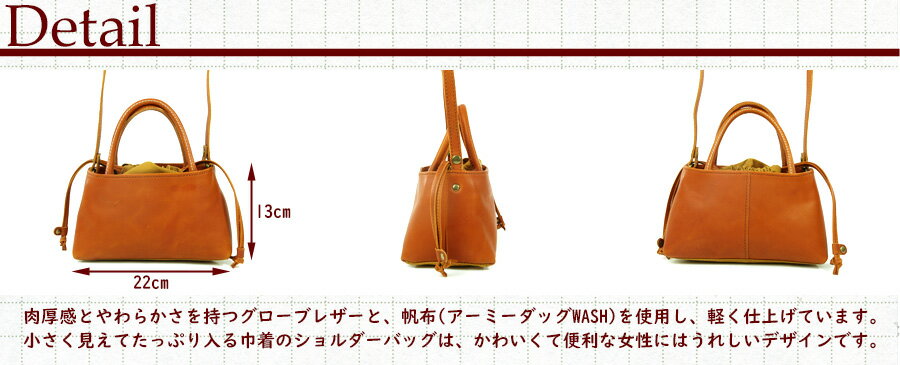 ギフト対応 商品詳細 商品番号 LMAK-205 仕様 ■サイズ(概寸表記) タテ13cm×ヨコ22cm×幅13cm ■重さ 325g ■本体開口部 16.5cm ■ポケット ○内ポケット オープンポケット:1つ ■ショルダーストラップ 幅:1.5cm 長さ:101.5cm〜115cm 高さ:48cm〜55cm ホック調節 ■持ち手 幅:1.3cm 長さ:27cm 高さ:9.2cm カラー 〇ブラック 〇キャメル 〇レッド 〇ネイビー 〇アイボリー 素材 グローブレザー(牛革)+帆布(アーミーダッグWASH) 原産国 日本製(made in JAPAN) 特徴 肉厚感とやわらかさを持つグローブレザーと、帆布(アーミーダッグWASH)を使用し、軽く仕上げています。